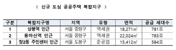 국토교통부(장관 김윤덕)는 10월 31일(금) 서울 상봉역, 용마산역, 창2동 주민센터 등 총 3곳 2,148호를 도심 공공주택 복합지구(이하 ‘복합지구’)로 지정한다. 도심 공공주택 복합사업(이하 ‘도심복합사업’)은 선호도 높은 도심 내 주택공급을 확대하기 위해 민간 정비가 어려운 노후 도심을 대상으로 공공이 주도하여