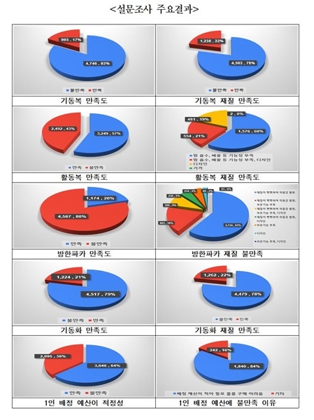 재질별 불만족도 역시 △기동복 78.4% △방한파카 60.7% △기동화 78.0% △활동복 60.3%로 기능성 부족·착용 불편·내구성 저하 등 ‘성능 저하형 불만’이 두드러졌다.