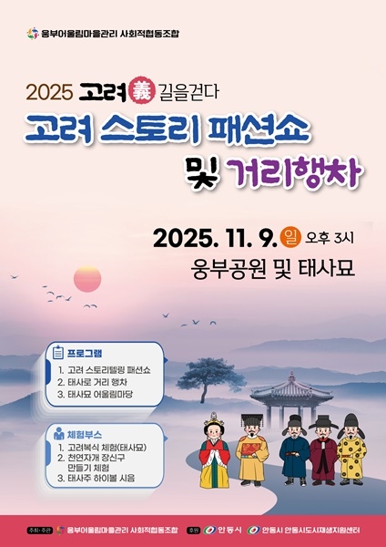 안동시 중구동 일대를 중심으로 지역 활력 증진과 주민 역량 강화를 위해 활동 중인 웅부어울림마을관리 사회적협동조합이 오는 11월 9일(일) 오후 3시, 안동 웅부공원 일원에서 ‘태사길 마을축제 〈고려義 길을 걷다〉’를 개최한다.