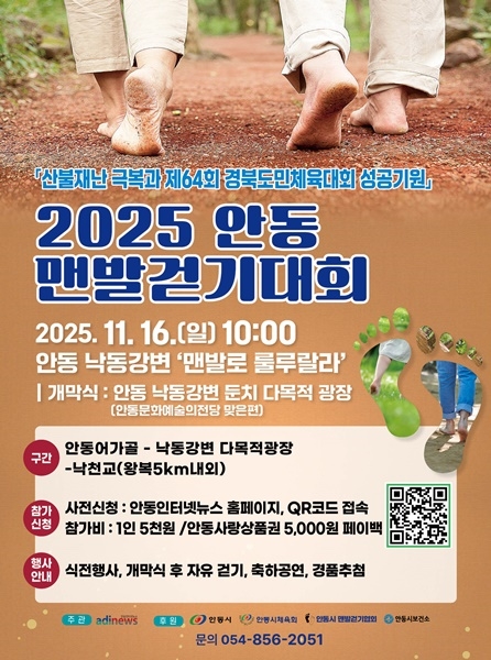 산불재난 극복과 제64회 경북도민체육대회 성공을 기원하는 ‘2025 안동 맨발걷기대회’가 오는 11월 16일(토) 10시 안동 낙동강변 ‘맨발로룰루랄라’ 일원에서 개최된다.