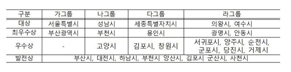 그룹별 최우수 지자체는(대상수상예정) 서울특별시(가 그룹), 성남시(나 그룹), 세종특별자치시(다 그룹) 및 의왕시·여수시(라 그룹)가 선정되었다.