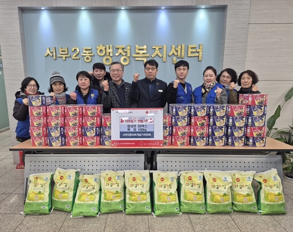 서부2동 바르게살기위원회(위원장 이병철)는 26일 서부2동행정복지센터를 방문하여 백미 100kg, 컵라면 50박스를 기탁하였다.