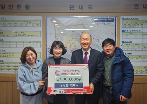 이번 나눔으로 조영의용소방대 30만 원, 자연보호북부동협의회 50만 원, 김재수 씨 100만 원, 갑제동 11통 주민 일동 20만 원의 성금이 각각 기탁됐다.