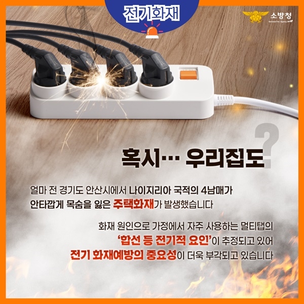 겨울철에 들어서면서 많은 화재 원인으로 멀티탭 합선 등 전기적 요인이 거론되고 있다. 전기화재는 일상에서 흔히 사용하는 전기설비 관리 소홀로도 충분히 발생할 수 있어 각별한 주의가 요구된다.