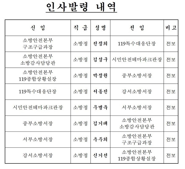 소방안전본부는 소방서장급(소방정) 8명을 전보하여 풍부한 현장 경험과 탁월한 업무 능력을 갖춘 지휘관들을 적재적소에 배치하여 조직의 안정과 대응 역량을 강화하는데 중점을 뒀다.