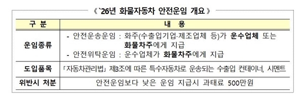 국토교통부(장관 김윤덕)는 ’26년에 적용되는 화물자동차 안전운임을 1월 중에 확정하여 고시할 예정이라고 밝혔다.